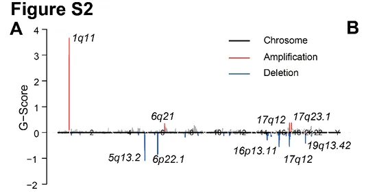 进一步结合拷贝数变异(CNV)分析发现,乳腺癌淋巴结转移过程中存在广泛的基因扩增与缺失事件(图S2A),包括 17q12 和 1q11 染色体区域的显著扩增 以及 6p22.1 和 5q13.2 区域的缺失,其中 17q12 区域检测到与乳腺癌密切相关的 ERBB2 扩增。