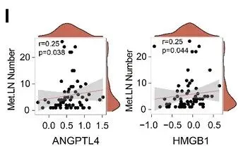 ANGPTL4 和 HMGB1 蛋白表达水平与淋巴结转移数显著相关(图 S2I)
