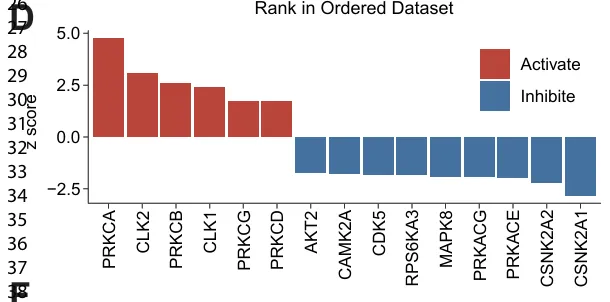 激酶活性推断进一步识别出15 种激酶活性增强(图 3D),其中 PKC 家族成员(PRKCA/B/C/D/G)和 CLK1/2 变化最为显著。