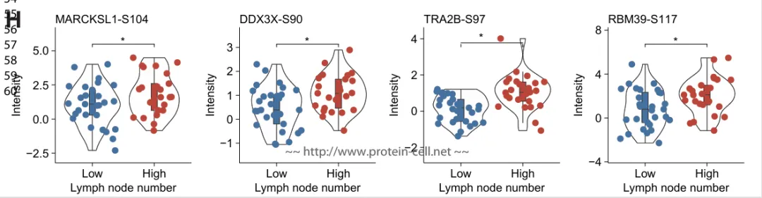 在生物标志物筛选方面,研究通过严格频率和表达标准,从 190 个候选位点中最终确定 62 个在转移性淋巴结中稳定上调的磷酸化位点,其中 9 个关键位点(如 MARCKSL1‑S104、RBM39‑S117、DDX3X‑S90 和 TRA2B‑S97) 具有较高的功能预测评分,并与淋巴结转移负荷显著相关(图3H)。这些位点主要参与 可变剪接与 RNA 调控过程,其上游调控以 PKC 激酶家族为主。总体而言,结果表明乳腺癌早期转移更加体现为磷酸化介导的信号调控与可变剪接重编程,为发现新的功能性标志物和潜在治疗靶点提供了重要依据。