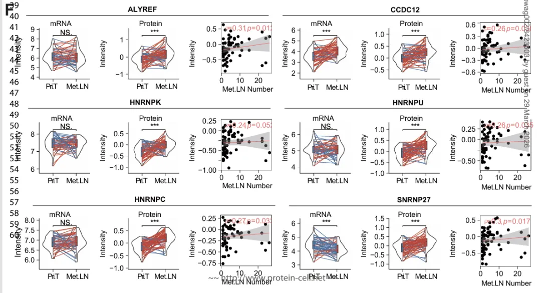 在调控层面,多种剪接因子和RNA结合蛋白(如 ALYREF、HNRNPK、HNRNPC、HNRNPU) 在转移性淋巴结中仅在蛋白层面上调,而转录层面无明显变化,且其蛋白丰度与淋巴结转移数量呈正相关(图 4F)。