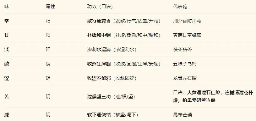 2.五味功效:辛散甘补淡渗利,酸收敛涩苦泄燥,咸软下