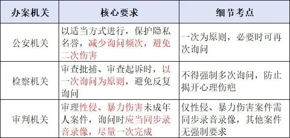 4.犯罪嫌疑人/被告人逃匿、死亡案件违法所得的没收程序5.依法不负刑事责任的精神病人的强制医疗程序(⭐️考点)1. 教育为主,惩罚为辅:未成年人误入歧途,以感化、挽救、重新教育为核心,惩罚为辅助手段。2. 特殊保护、优先保护:全程保障未成年人名誉、隐私、身心发展,优先保障其合法权益。3. 社会调查原则:查明未成年人成长背景、家庭情况、犯罪原因等,针对性开展教育挽救。4. 程序灵活宽缓:诉讼流程更贴合未成年人身心特点,减少严苛程序带来的负面影响。1. 适用规则:并非对未成年人完全禁止逮捕,可捕可不捕的坚决不捕;犯罪情节严重、社会危险性大的,依法逮捕。2. 特殊保障:被逮捕的未成年嫌疑人/被告人,未完成义务教育的,应当保障其完成义务教育,可安置于专门学校管控并完成学业。3. 未成年人并非逮捕适用排除对象,仅为严格限制,同时兼顾义务教育权利。(⭐️考点)(1)检察院审查批捕、法院决定逮捕时,应当讯问未成年嫌疑人/被告人,应当听取辩护律师意见。(2)讯问笔录需交由到场的法定代理人或其他人员阅读/宣读,对笔录内容有异议的,应当核实并准予更正、补充。(1)心理疏导:法院可对所有未成年人(被告人、被害人、证人) 进行,属于心理安抚,无主体限制。(2)心理测评:需经未成年人及其法定代理人同意,仅能对未成年被告人(小坏蛋) 进行,不得对未成年被害人、证人(小可怜)开展。| 例1:大喵16岁故意伤害大王17岁,检察院原则上只能询问大喵一次,询问大王一次。❌️询问未成年嫌疑人(大喵,小坏蛋)无次数限制,询问未成年被害人(大王,小可怜)才以一次为原则。例2:询问所有未成年被害人、证人,均应当同步录音录像。❌️仅性侵、暴力伤害案件需同步录音录像,其他未成年人案件无此强制要求。例3:可对未成年被害人进行心理测评。❌️心理测评仅针对未成年被告人,未成年被害人仅可做心理疏导。 |