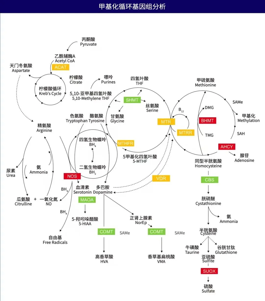 甲基化循环在维系生命的组织器官中扮演至关重要的角色,是决定人生理、情绪和精神的核心生化反应。甲基化反应包含五个循环,其中包含的13个基因决定了关键酶的表现,由大脑的情绪层层表现,影响到全身细胞分裂与修复、血管松弛、解毒功能与能量生成等等。附图是一张甲基化基因组分析的实例。