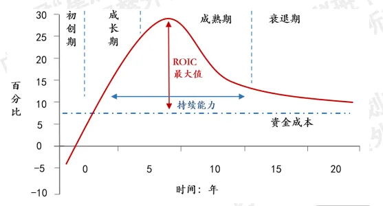 •ROIC峰值决定企业能创造的最大回报,ROIC高于资金成本的持续时长对应产品和企业的生命周期。