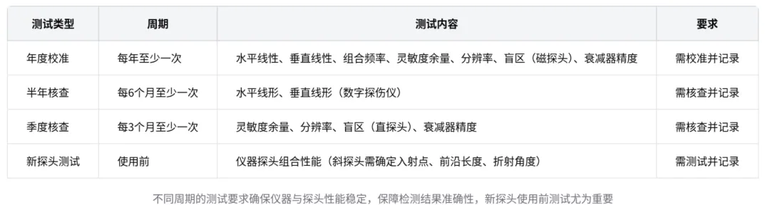 年度校准:每年至少对仪器与探头组合性能中的水平、线性、垂直、线性组合频率、灵敏度、余量分辨率盲区,主要做磁探头测试以及仪器衰减器的精度进行一次校准,并记录。