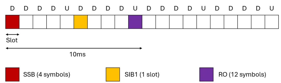 为了提高网络能效 (NES),目前流行的做法是简单地增加6G中的SSB周期,例如,在初始小区选择时增加到160毫秒。这种做法主要是基于在空小区中观察到的NES问题。下文将针对不同的小区负载假设和TR 38.864中FR1 Set 1的参考参数,对各种SSB周期进行NES分析。小区采用单波束SSB/SIB1模式。此外,我们的分析假设SIB1的周期与SSB周期相同,而PRACH RO配置为PRACH配置索引98,且周期与SSB周期相同,如下图用于NES评估的公共信道配置: