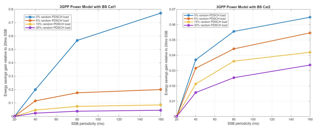 对于Cat-1基站,NES对网络流量非常敏感。例如,在5%、15%和30%的低负载下,80ms SSB周期下的NES分别约为18%、8%和4%。