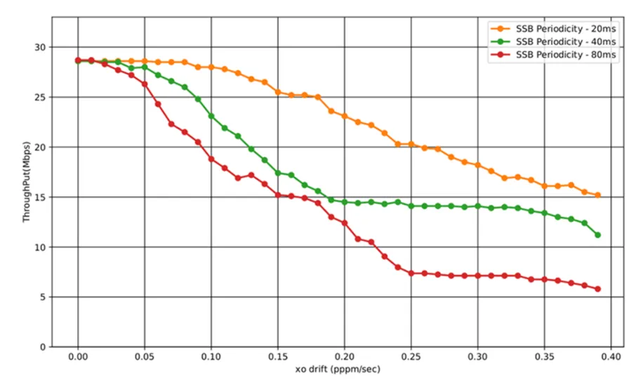 例如下图所示的SSB周期对吞吐量影响的测量结果例子,基于测量结果展示了SSB周期对吞吐量的影响。该设置假设信道为100MHz TDD、4Rx、MCS27 256Q、AWGN信道。PDSCH与最近的SSB之间的时间间隔等于SSB周期。从图中可观察到,SSB周期对PDSCH吞吐量有显著影响。具体而言,在频率漂移为0.1 ppm/sec的情况下,与20 ms周期相比,40 ms周期的吞吐量损失为18%,80 ms周期的吞吐量损失为33%。因此,增加SSB周期的尝试需要充分论证其合理性。