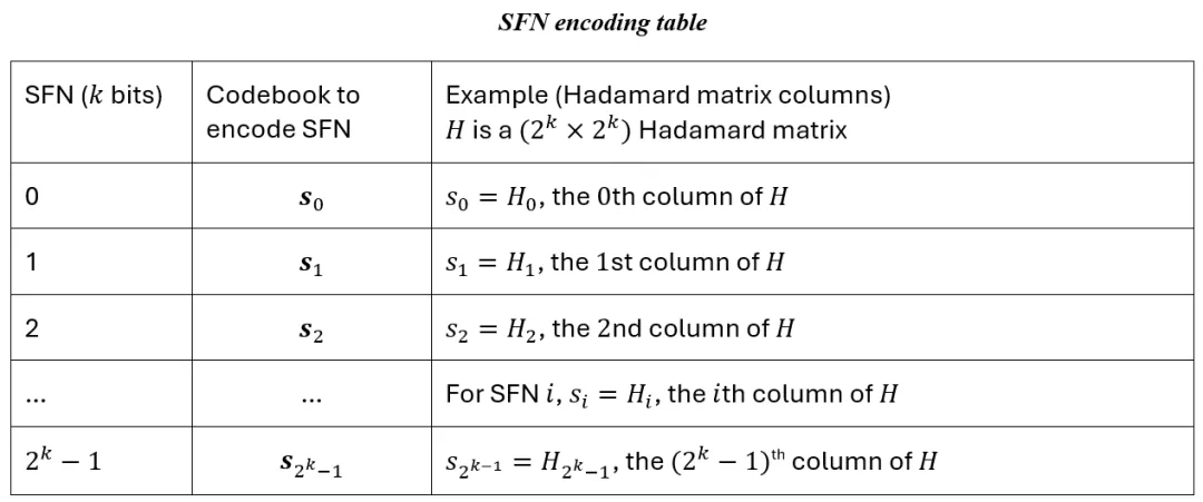 分配给PBCH的RE将被分为两部分:一部分是包含(部分)SFN比特的时变分量,另一部分是包含剩余PBCH比特的时不变分量。时不变分量采用24位CRC校验和进行保护,并使用极化码进行编码,同时进行速率匹配以适应分配给它的接收误差,这与NR中PBCH的编码方式类似。由于时不变分量的变化速度远低于时变分量,只要时不变分量不在信息比特变化的边界处,接收机就可以采集多个时不变分量的样本并进行软合并以进行解码。假设PBCH的时变分量和时不变分量的检测是相干的,并使用PBCH DMRS进行信道估计。时变分量(SFN)的特性是,在每个SSB周期内,其值会随着循环次数的增加而递增。为了利用这一特性,我们考虑使用SFN循环使用的码本序列对其进行编码,如下表所示。例如,该码本可以由Hadamard矩阵的列构成。