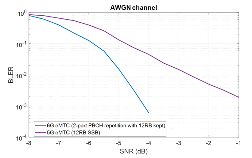在3MHz频谱分配的情况下,UE仅基于中间12个RB中的第一个PBCH重复进行解码。如下图所示的3MHz频谱分配的PBCH解码性能,与5G基于分割的PBCH解码相比,在加性高斯白噪声 (AWGN) 环境下,所需的信噪比 (SNR) 降低了2dB。