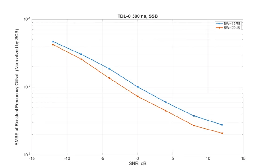 具体而言,为了达到1%的经SCS归一化的频率误差RMSE,采用20个RB的SSB所需的信噪比比采用12个RB的SSB低2dB。因此,保持与5G相同的20个RB的SSB带宽是有益的。