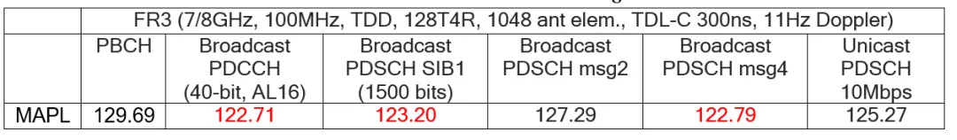 通常情况下,广播信道是下行链路的覆盖瓶颈。具体而言,广播PDCCH已被确定为5G 4GHz TDD的瓶颈。如下表所示的FR3 DL通道链路预算,除了广播PDCCH之外,广播PDSCH(用于SIB1和Msg4)也是FR3下行链路的瓶颈。这主要是由于它们的有效载荷较大以及使用了次优的波束成形。因此,研究广播PDCCH和PDSCH(包括用于SIB1和Msg4的PDSCH)的覆盖增强方案将十分有益。