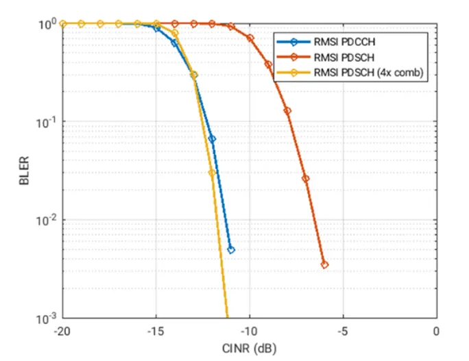 在5G中,SIB1的有效载荷大小可能很大,例如FR1的有效载荷约为800到 1500比特。SIB1 PDSCH可能成为下行链路的覆盖瓶颈之一。例如,如下图 所示的5G RMSI PDSCH与PDCCH覆盖范围对比,对于单次解码(红色对比蓝色),在1% BLER下,SIB1 PDSCH的性能比SIB1 PDCCH差5dB,而如果SIB1 PDSCH在每个RMSI周期内进行4次合并(黄色对比蓝色),则二者的性能相近。