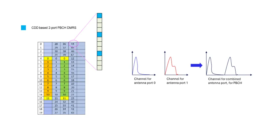 在4G网络中,PBCH支持多个天线端口以实现发射分集,从而提高可靠性。而在5G网络中,SSB只有一个端口,UE会根据最强RSRP来选择SSB及其关联的小区(例如在初始接入时)。然而,单端口SSB测量并不能反映相应的MIMO信道容量。例如,来自某个小区的最佳SSB可能并非提供最强 RSRP,但却可以提供更高的rank,从而带来更高的吞吐量。因此,SSB设计若能支持MIMO信道测量,将有助于UE选择提供最佳吞吐量的SSB beam/小区。下图展示了一个多端口PBCH的示例(带CDD多路复用天线端口的PBCH DMRS),其中来自两个天线端口的两个PBCH DMRS序列复用到同一组PBCH RE上。可以在频域中对第二个DMRS序列应用相位ramp,从而使其在时延域中的信道脉冲响应 (CIR) 与第一个DMRS序列的CIR分离。它本质上是一种基于CDD的PBCH方案,自然地提供了每个天线端口的CIR测量,从而简化了MIMO信道测量。