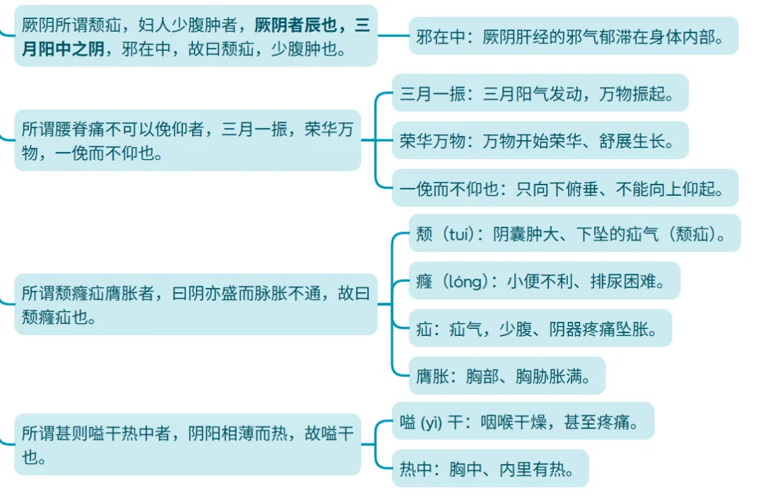 㿗疝(阴囊肿)、妇人少腹肿:三月阳中有阴,邪客厥阴(络阴器、少腹)。