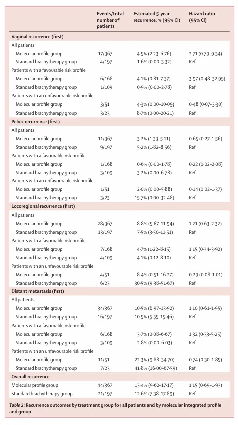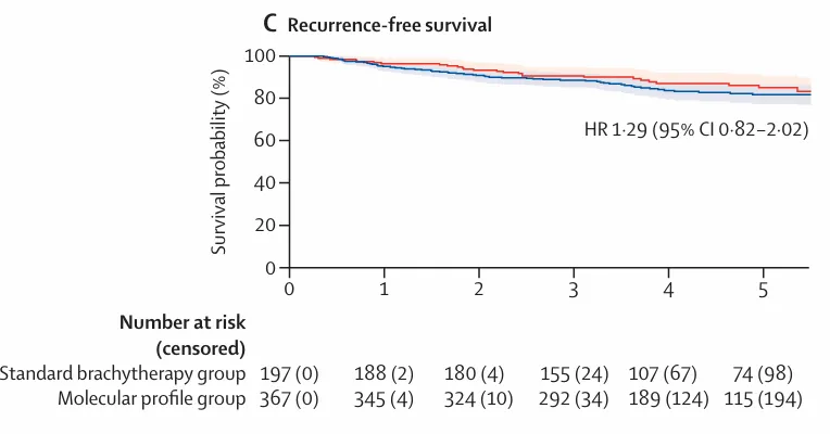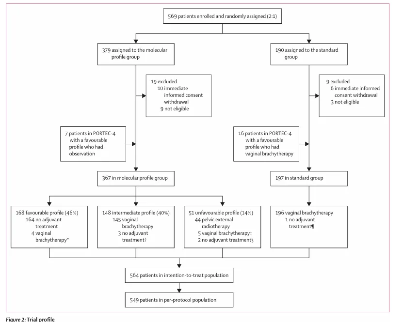 结果显示,在5 年总体阴道复发率较低的前提下( 分子分型组4.5% vs标准组 1.6%),基于分子分型制定的治疗策略在阴道控制方面不劣于标准近距离放疗,同时可使近一半患者(46%)免除不必要的辅助放疗而不影响无复发生存和总生存,明确指出传统“一刀切”式辅助治疗存在过度治疗问题。