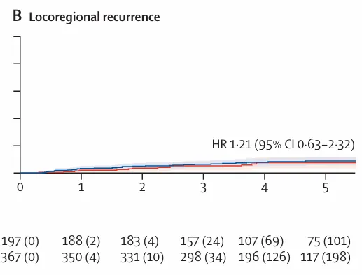 图3:5 年累积发生率曲线及 Kaplan–Meier 生存曲线B)PORTEC‑4a 全体人群的局部区域复发