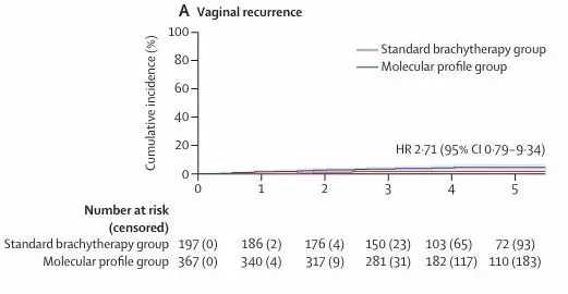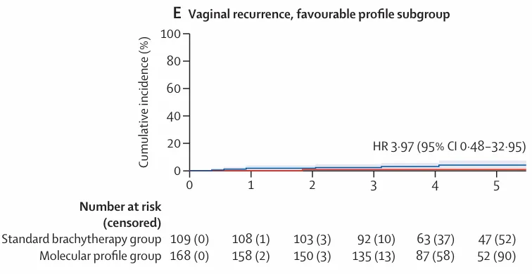 图 3:5 年累积发生率曲线及 Kaplan–Meier 生存曲线,E)具有有利风险分型患者的 5 年阴道复发累积发生率曲线