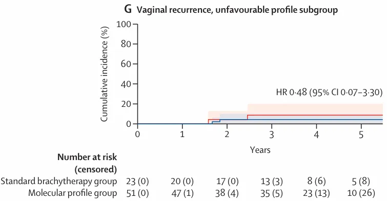 图 3:5 年累积发生率曲线及 Kaplan–Meier 生存曲线,G)具有不利风险分型患者的 5 年阴道复发累积发生率曲线