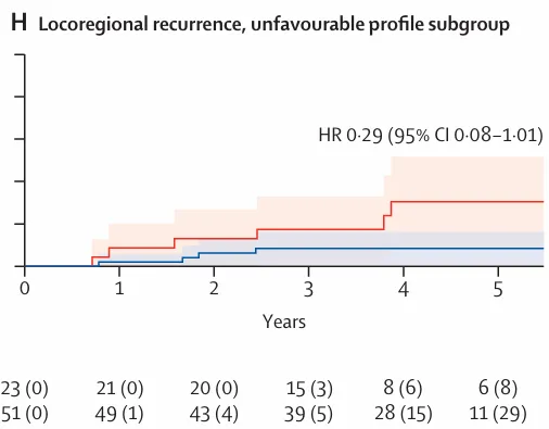 图 3:5 年累积发生率曲线及 Kaplan–Meier 生存曲线,H)具有不利风险分型患者的 5 年局部区域复发累积发生率曲线