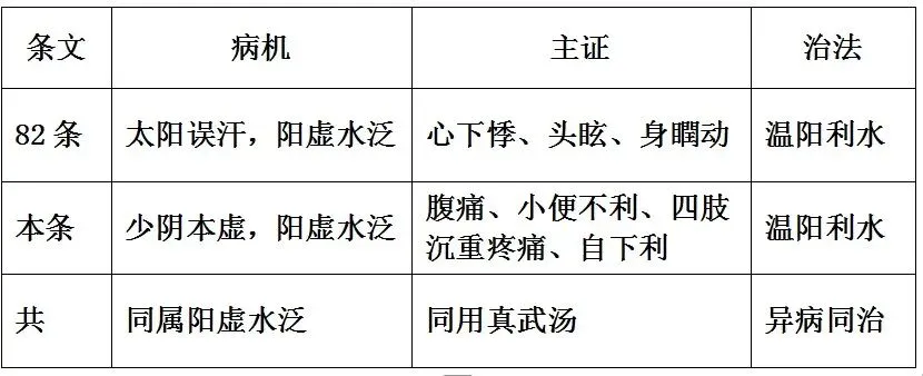 《伤寒论》第316条:“少阴病,二三日不已,至四五日,腹痛、小便不利、四肢沉重疼痛、自下利者,此为有水气,其人或咳、或小便利、或下利、或呕者,真武汤主之。”