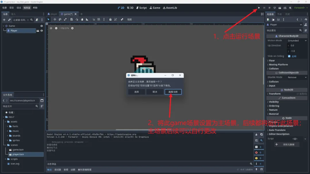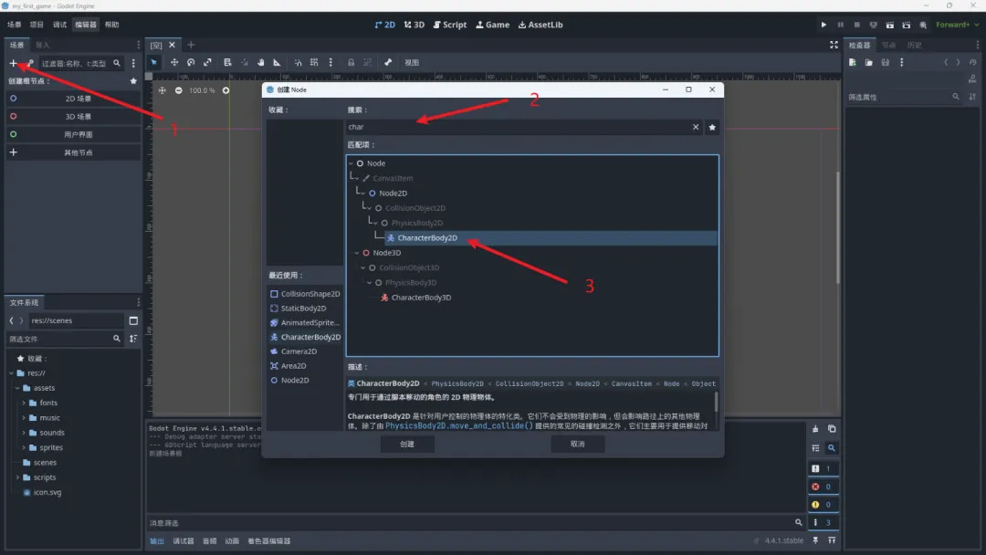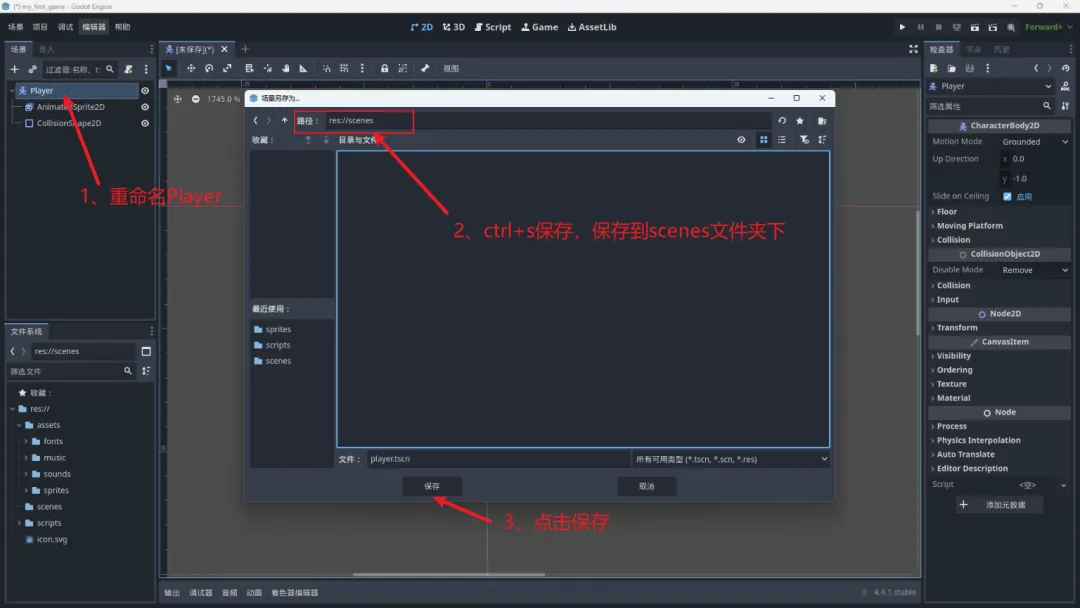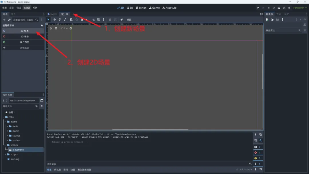 1、创建2d场景,并保存为game场景到scenes文件夹下