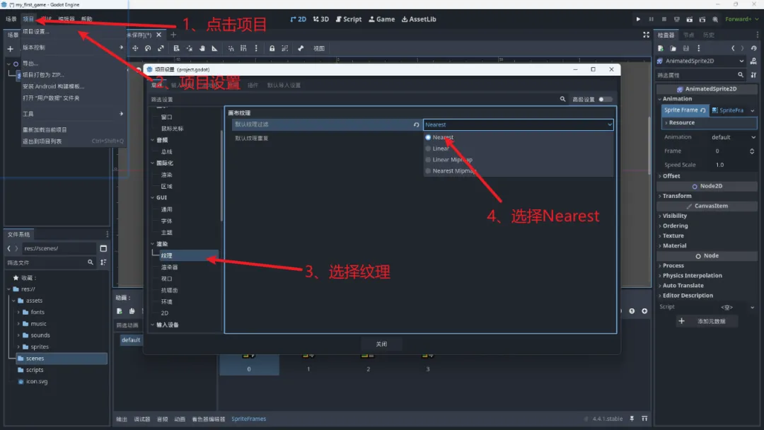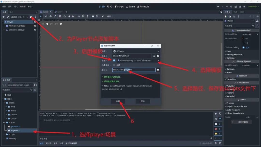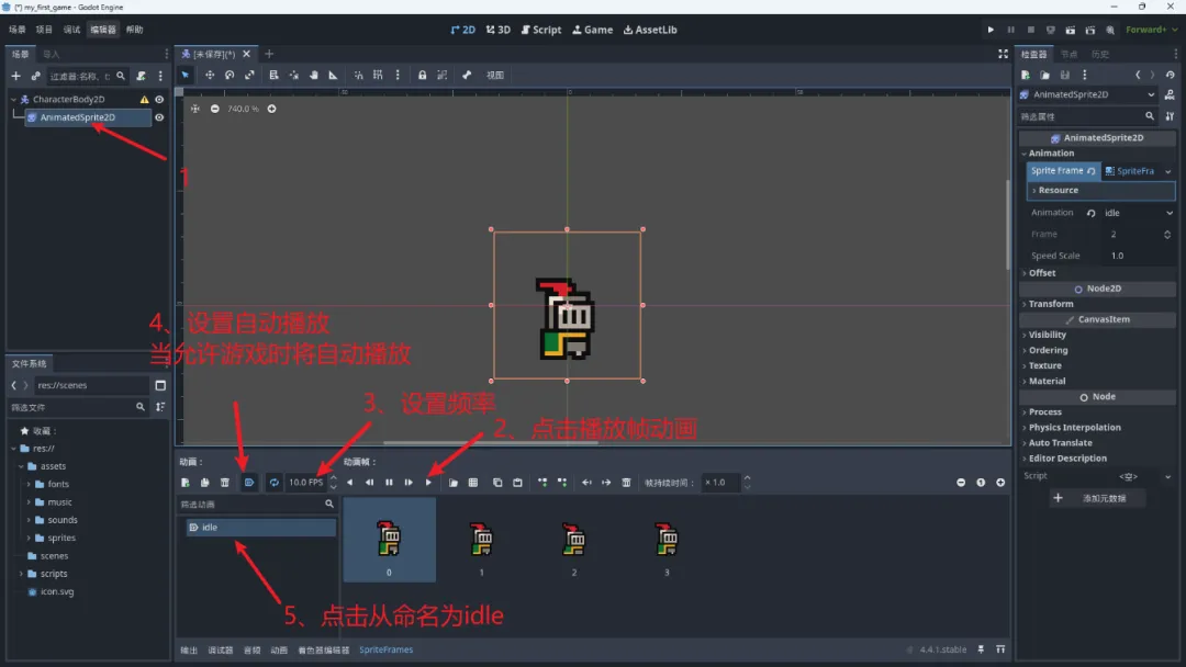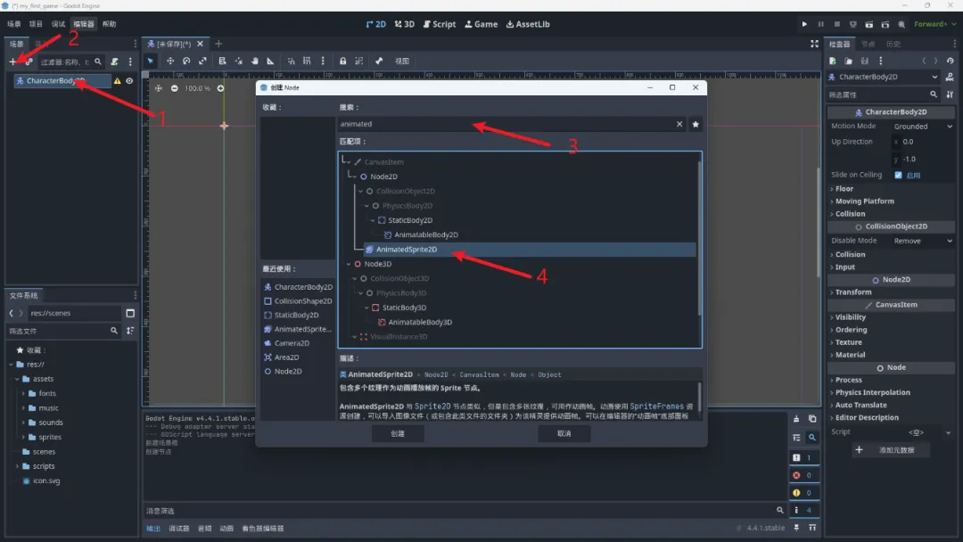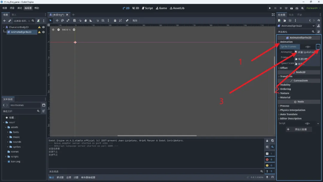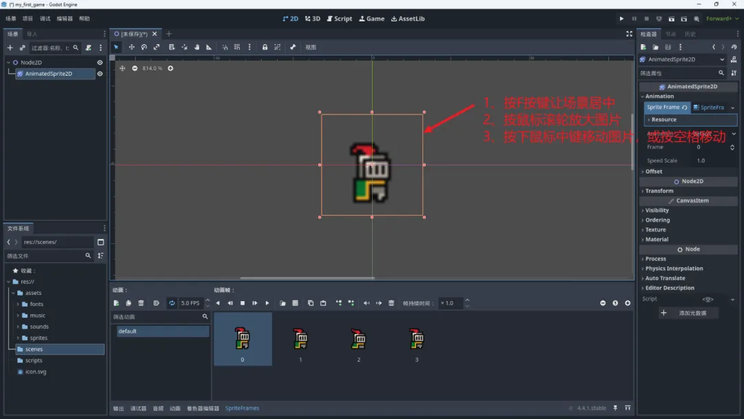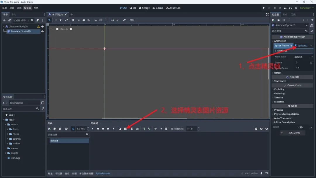 2、创建AnimatedSprite2D节点,用于创建帧动画玩家