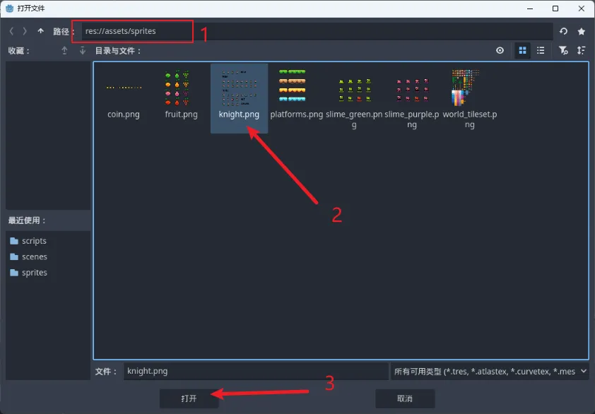 5、找到之前导入的assets资源sprites文件夹下knight.png玩家精灵表