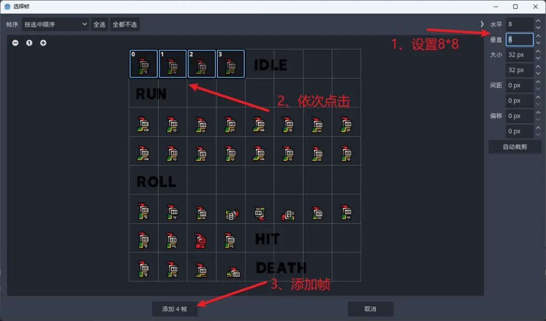6、添加动画帧,knight.png是8*8的精灵表,需要设置水平和垂直分割数量,选择IDLE待机动画帧