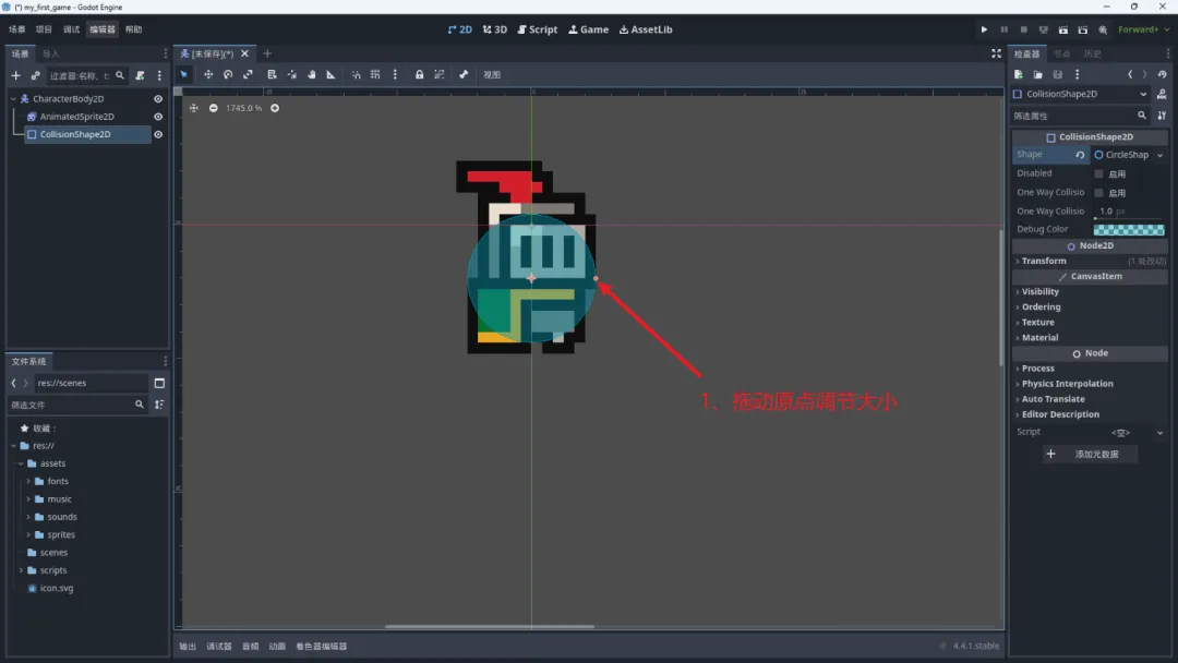 为CollisionShape2D节点设置碰撞形状,这里选择圆形