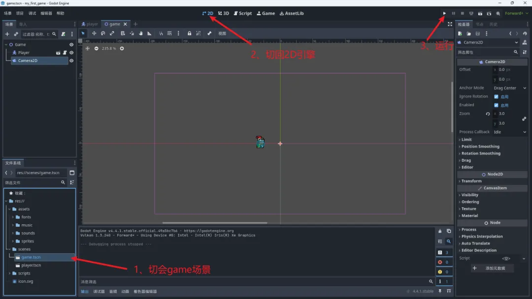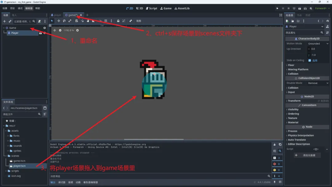 可能出现的问题:玩家无法移动,可能还是camera2D节点为玩家的子节点的原因,我也不清楚,只是在这个测试场景下会这样,在下一节用瓦片创建地图下不会这样。