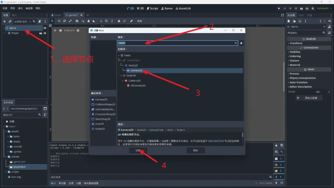 发现玩家会直接掉落,如果玩家没有掉落可能是你将Camera2D节点设置为Player的子节点了,节点拖回到Game子节点恢复