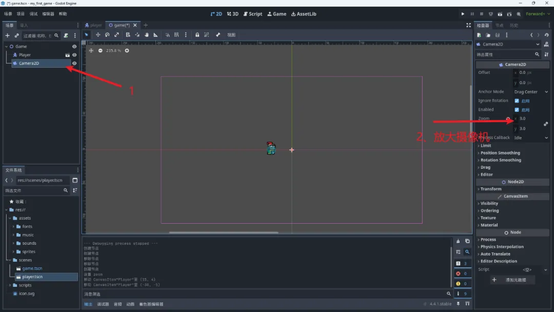 运行场景后发现玩家很小,此时设置摄像机节点,设置游戏窗口能看到的内容