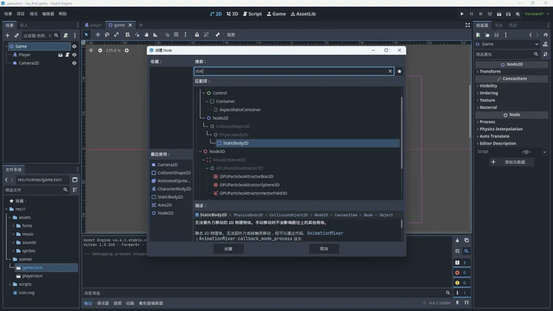 测试没问题后,删除StaticBody2D节点,下一节中将用瓦片创建地图