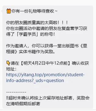 日更第99天。今天是2026年4月9日,周四。镇江,14℃到23℃,小雨。晚上回到家,看到一个特别的包裹。拆开层层保护,一本崭新的、封面醒目的书出现在眼前——《里程碑:从商业起点到终局推演》。这是一份来自“一堂”的礼物,一份双份的喜悦。源于2026年的“春马出圈”活动,我邀请的朋友在复盘营中勤奋精进,荣获“学霸学员”称号。令人温暖的是,一堂不仅为学霸学员准备了这份《里程碑》作为嘉奖,也为我们这些邀请人同步寄送了一本。这既是分享朋友的成就,也像在说:每一份真诚的分享与连接,都值得被鼓励。感谢我那位勤奋的朋友,也感谢这份充满心意设计。🎁 一份礼物: