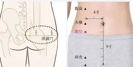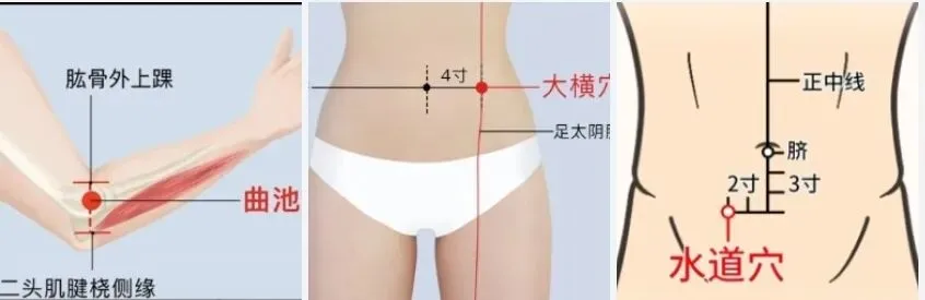 ①主穴:曲池、天枢、大横、阴陵泉、丰隆。(穴位图上面有)
