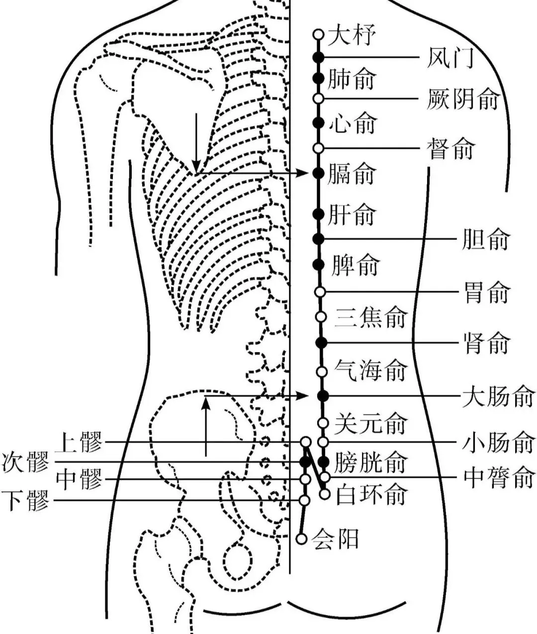 ①主穴:以督脉、膀胱经区域为主,包含大椎、脾俞、胃俞、肾俞、至阳、命门、腰阳关等穴。