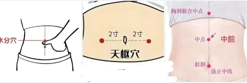 ①主穴:中脘、天枢、水分、水道、大横、曲池、支沟、内庭、上巨虚、阴陵泉、丰隆、带脉。
