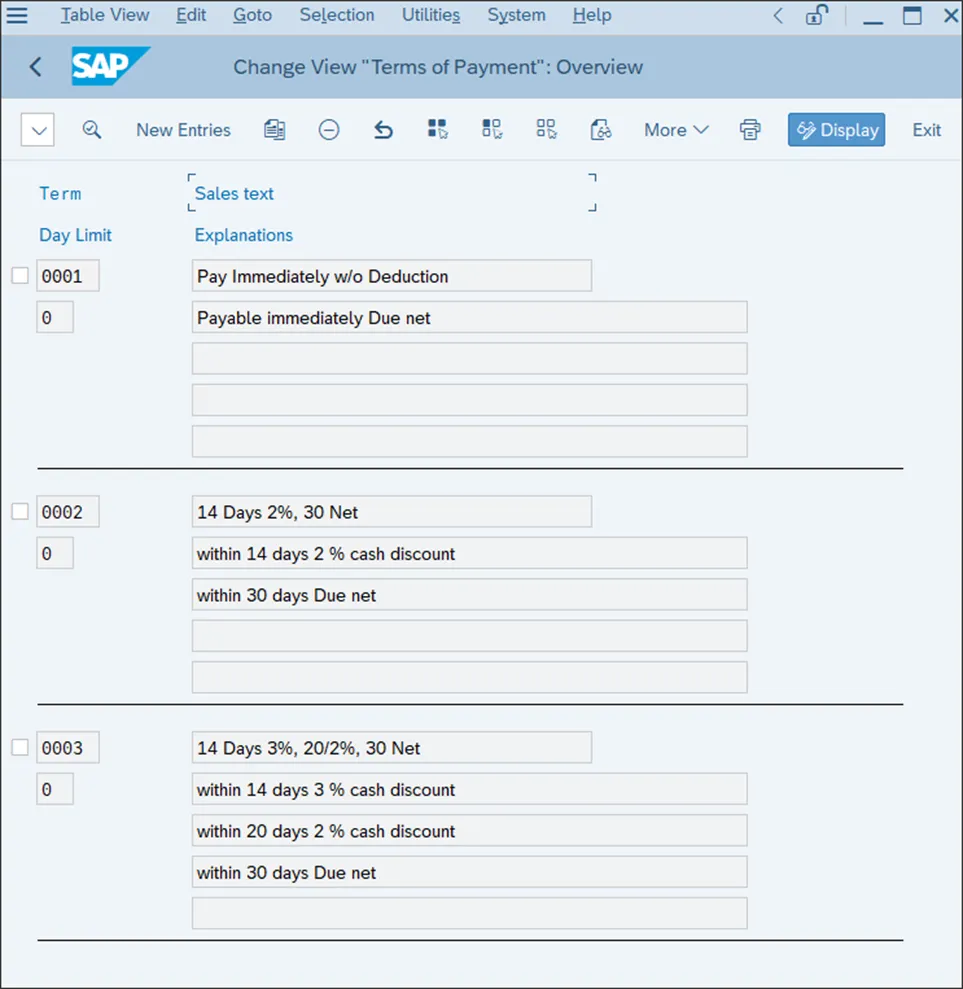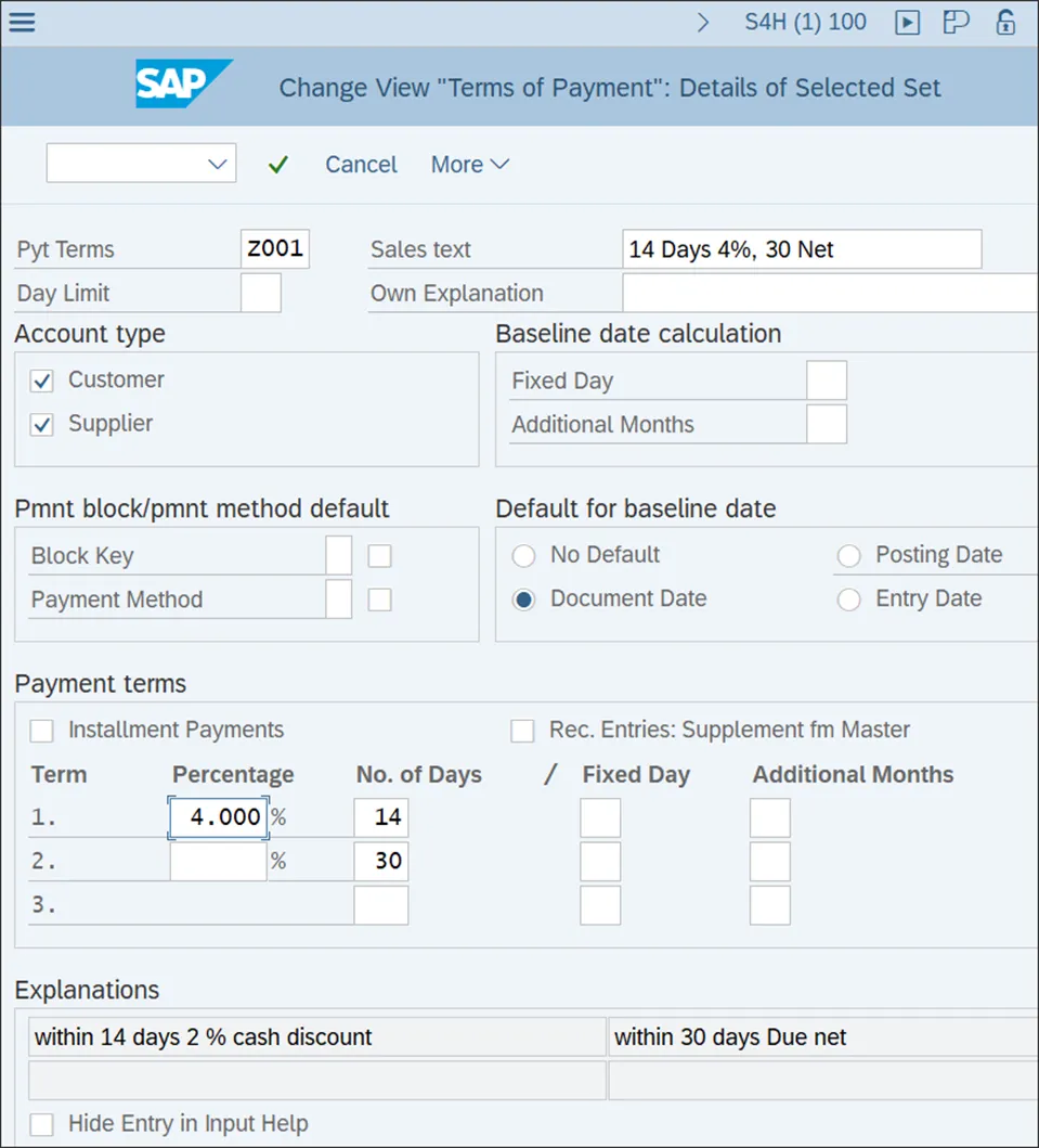 与应付账款相关的下一类主要交易是付款。已过账的发票,无论来自财务会计还是物料管理,都会作为待付款的未清项目进行过账。付款条件取决于付款条款。付款条款是一种配置对象,是供应商行项目的一部分。付款条款决定了付款的到期时间以及是否适用折扣。例如,如果没有宽限期且需全额支付无任何折扣,付款条款可以是立即净付。例如,在下图所示的屏幕中,付款条款0002规定全额付款应在30天内到期,但如果在14天内付款,则可享受2%的折扣。要配置付款条款,请按照菜单路径:财务会计 • 应收账款和应付账款 • 业务交易 • 收到的发票/贷项凭证 • 维护付款条款,或输入事务代码OBB8。上图还显示,SAP S/4HANA提供了许多标准付款条款,涵盖了业务中出现的许多标准付款条件。当然,你可以创建新的付款条款,与其他配置对象一样,一个好的做法是使用以Z或Y开头的自定义编号范围来命名它们。让我们创建一个新的付款条款,即在14天内付款给供应商可享受4%的现金折扣,或在45天内净付。首先,找到一个类似的标准付款条款,如0002。选中0002左侧的复选框,然后从顶部菜单中选择“复制为”,这将显示下图所示的屏幕。确定付款条款对哪些类型的账户有效:客户、供应商或两者。付款条款是同时用于应付账款和应收账款的对象,但在这个字段中,如果在其他应用中不需要,可以限制其使用。基准日期是付款条款计算开始的日期。通常,基准日期由未清项目本身确定。但是,在这个字段中,你可以指定从固定日期开始计算,并/或在基准日期上添加额外的月份。- 付款冻结/付款方式默认值(付款冻结/付款方式默认值)