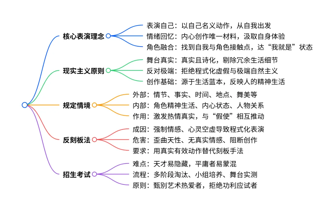 为了用自己的情感,根据自己对事实的真切态度去估计事实,演员在心里可以向自己提出这样的问题并且解决这样的任务:"我的内在的人的精神生活中什么样的情境,我本人的什么样真切的想法、愿望、意向和什么样活生生的特点、资质和缺陷,才能够促使作为人一演员的我,像我所扮演的剧中人物那样去对待剧中的人们和事件呢?"(《全集》第4卷,276页)