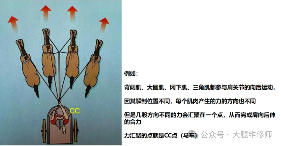 实际上,在完成这一动作时,并不是这些肌肉的所有肌纤维都参与,而是其中一部分肌纤维被激活。这些协同完成同一动作的肌纤维所产生的力的向量,会汇聚于一处——即协调中心CC点。