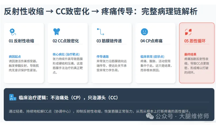 当CC点(协调中心)因长期过度使用、损伤或炎症等因素出现筋膜致密化时,会引起肌肉力量失衡、运动控制异常,最终导致疼痛和功能障碍。