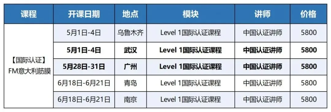 理论需要实践来验证,技术需要 hands-on 来精进。若您希望深入掌握这套源自意大利的筋膜手法(Stecco FM®),亲身感受如何通过触诊定位致密化的协调中心,用滑动摩擦恢复筋膜的弹性与滑动,我们诚挚邀请您参加2026年5月1日在武汉举办的FM筋膜手法培训班。课程将系统讲解筋膜手法的力学模型与临床应用,带您从理论走向实操,真正实现“治疗病变的协调中心,而非疼痛的感知中心”。