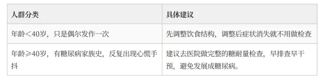 这种情况绝大多数都是饮食结构问题,不是糖尿病,不用过度恐慌:如果你只吃碳水(米饭、面条、馒头),几乎不吃蛋白质,大量精致碳水会快速被肠道吸收,血糖一下子飙升,刺激胰岛素大量分泌,胰岛素又会快速把血糖压到偏低的水平,形成”血糖过山车”,就会出现低血糖心慌手抖----哪怕是完全健康的人,只吃碳水不吃蛋白,也会出现这个问题。
