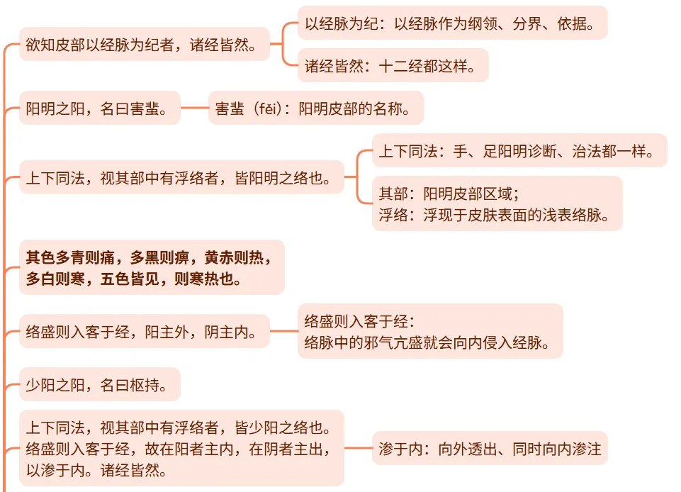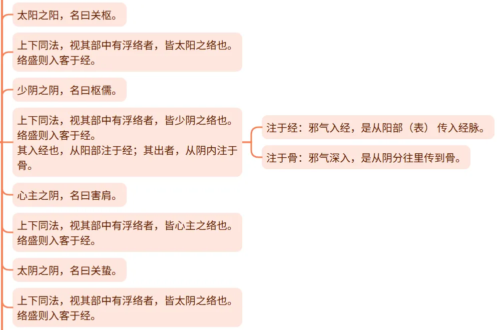 1.余闻皮有分部,脉有经纪,筋有结络,骨有度量。其所生病各异,别其分部,左右上下,阴阳所在,病之始终,愿闻其道。 (皮肤有分区,经脉有主支,筋有结聚和联络,骨头有长短尺度,各部位生的病不同。如何辨明病的部位、上下左右、阴阳属性,病的起止。)