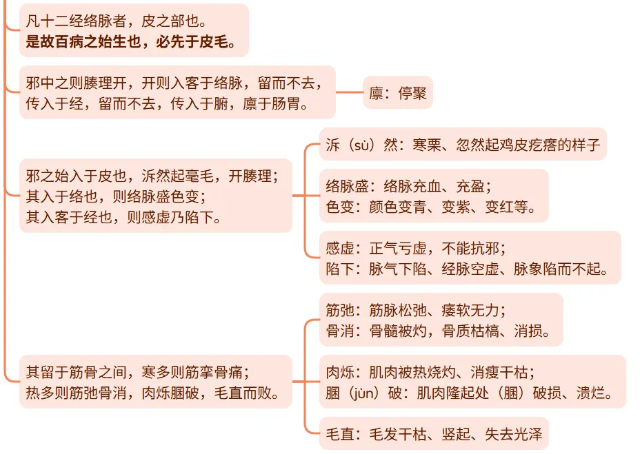 传变规律:外感邪气→先客皮部→入络→入经→入腑→入脏;由浅入深、层层内传。