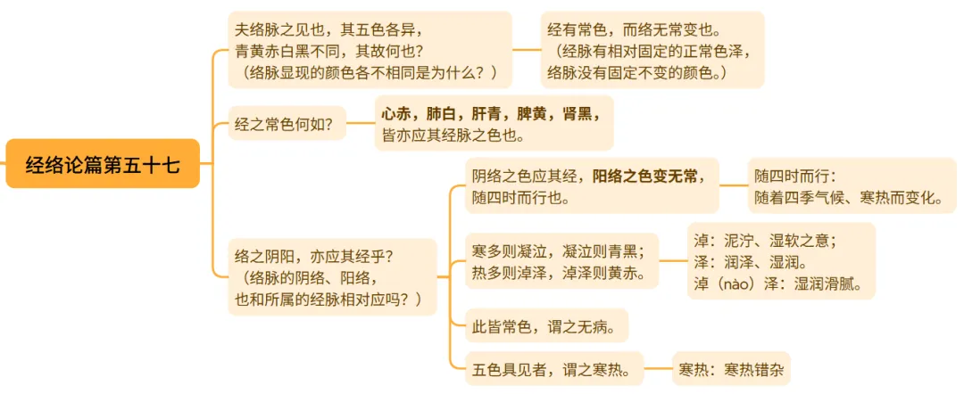 二、经络论篇第五十七:主要讲了经、络、孙络的颜色。