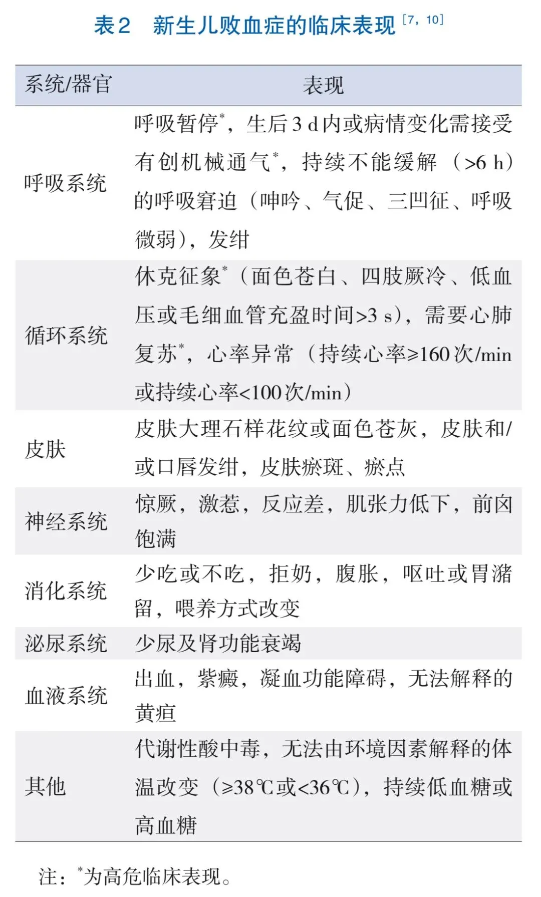 新生儿败血症无特异性临床表现,可涉及多个脏器,需密切观察,一旦出现疑似感染症状,应立即进行全面体格检查和评估。休克、需要心肺复苏以及生后3d内或病情变化需接受有创机械通气是感染的高危临床表现,应立即经验性使用抗菌药物。