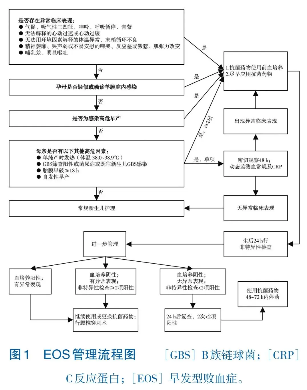 EOS的重要危险因素包括感染高危早产、孕母疑诊或确诊羊膜腔内感染。羊膜腔内感染疑诊标准为产妇体温≥38.0℃加上下列至少2项:①胎心率增快;②母心率增快;③子宫紧张有压痛;④羊水异味。确诊需有羊水或胎盘病原学证据或胎盘病理学证据。